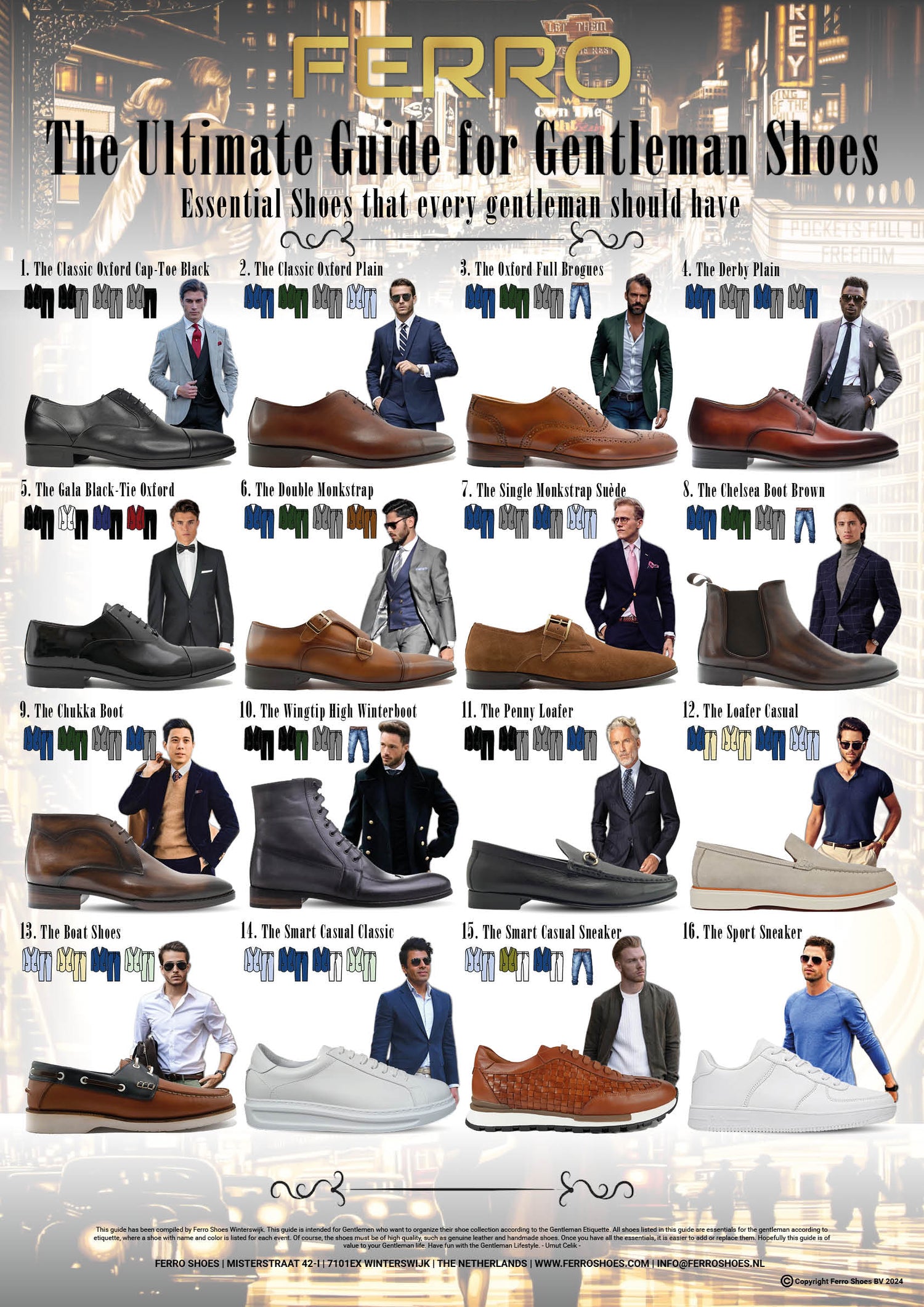 Soms kan het verwarrend zijn bij het kiezen van de juiste schoenen. In de Gentleman etiquette zijn enkele basisschoenen met de juiste namen samengesteld om de bewuste Gentlemen op weg te helpen. Zo hebben wij bij Ferro Shoes de essentials verzameld en overzichtelijk samengesteld. Beginnend bij de eerste schoen; the Classic Oxford tot en met de laatste essential is te zien welke model in welke kleur te combineren is. The Ultimate Guide for Gentlemen Shoes.