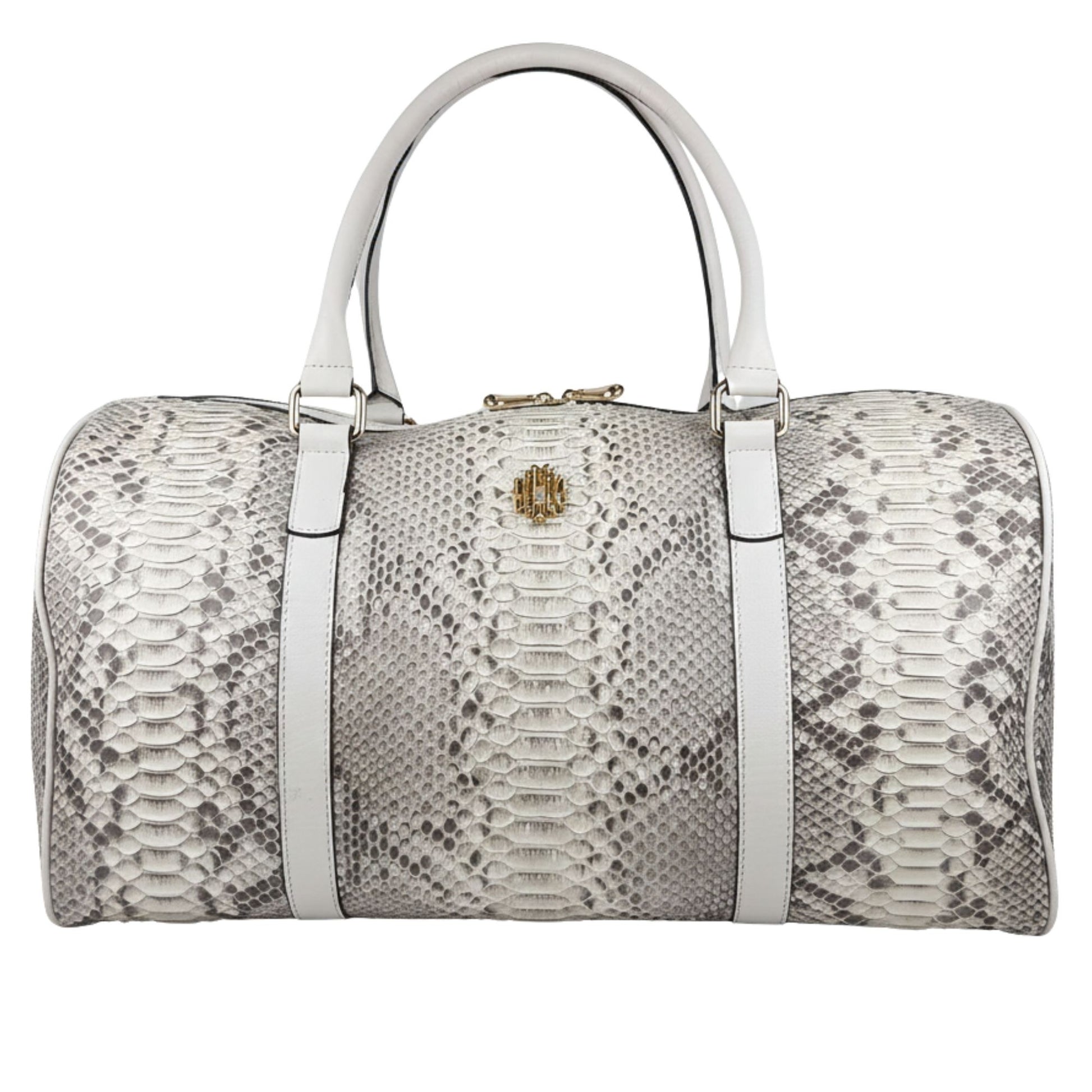 Ervaar pure elegantie met reistas Julian, een waar kunstwerk in design en vakmanschap. Deze volledig met de hand vervaardigde weekender is gemaakt van 100% echte pythonhuid in een stijlvolle naturel tint. Het natuurlijke patroon van de huid zorgt voor een uniek karakter – geen enkele tas is hetzelfde.