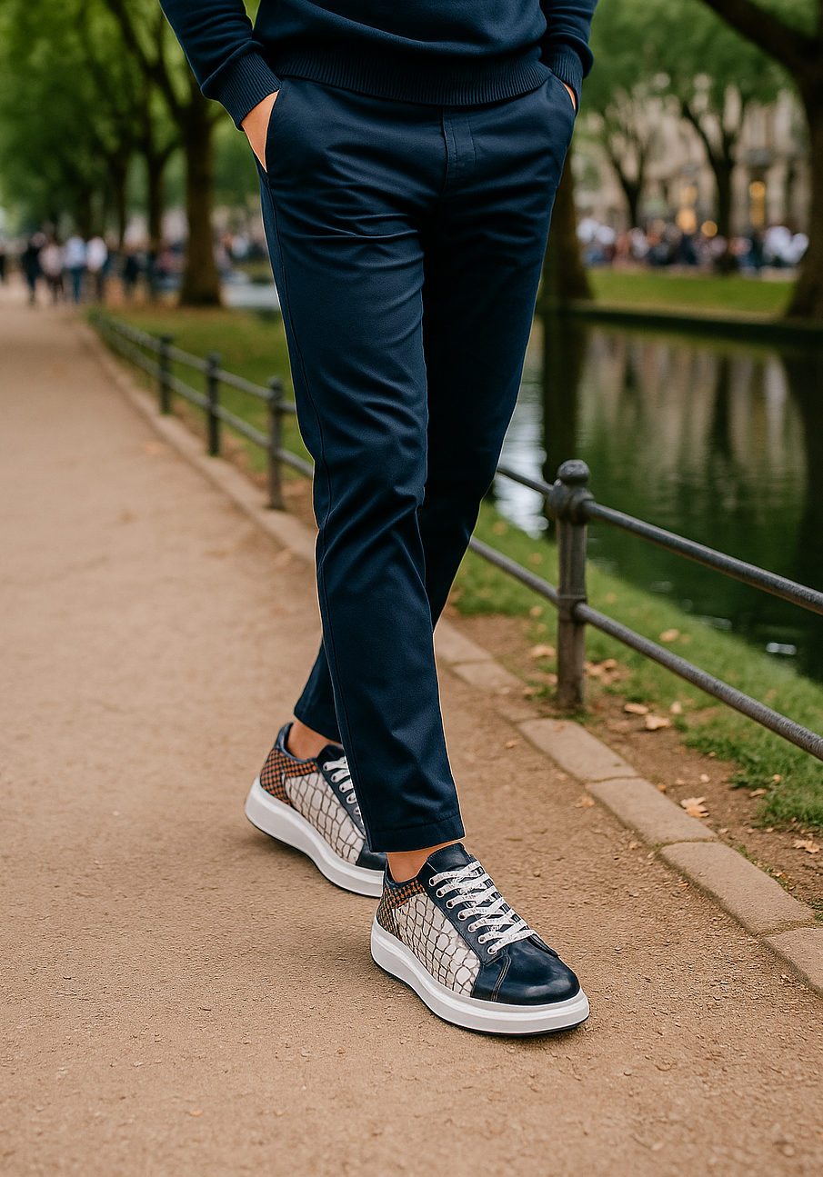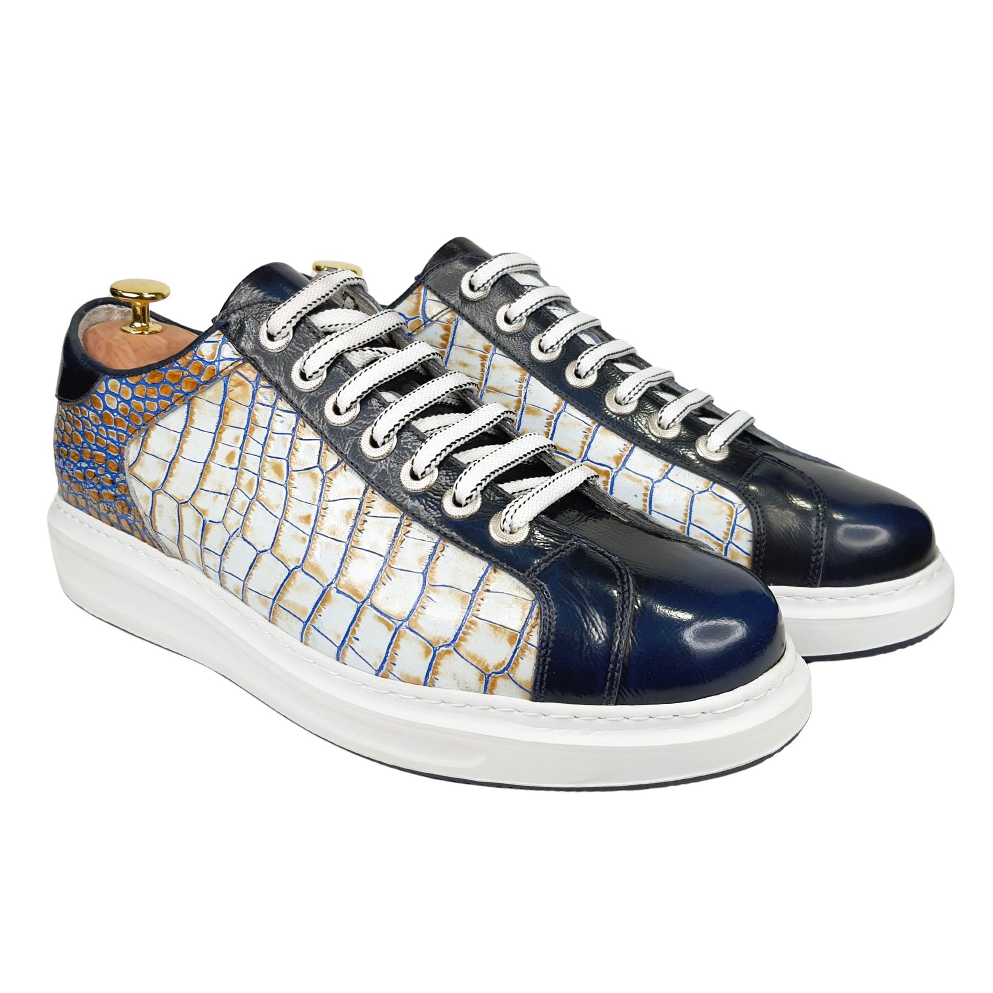Het bovenwerk van de Alfredo is een indrukwekkende mix van diep donkerblauw leer aan de neus en hiel, en een opvallende camel krokodillenprint aan de zijkanten. De fijne details, zoals de blauw omrande stiksels en de zilver veteroogjes, geven deze sneaker een onmiskenbare luxe uitstraling.