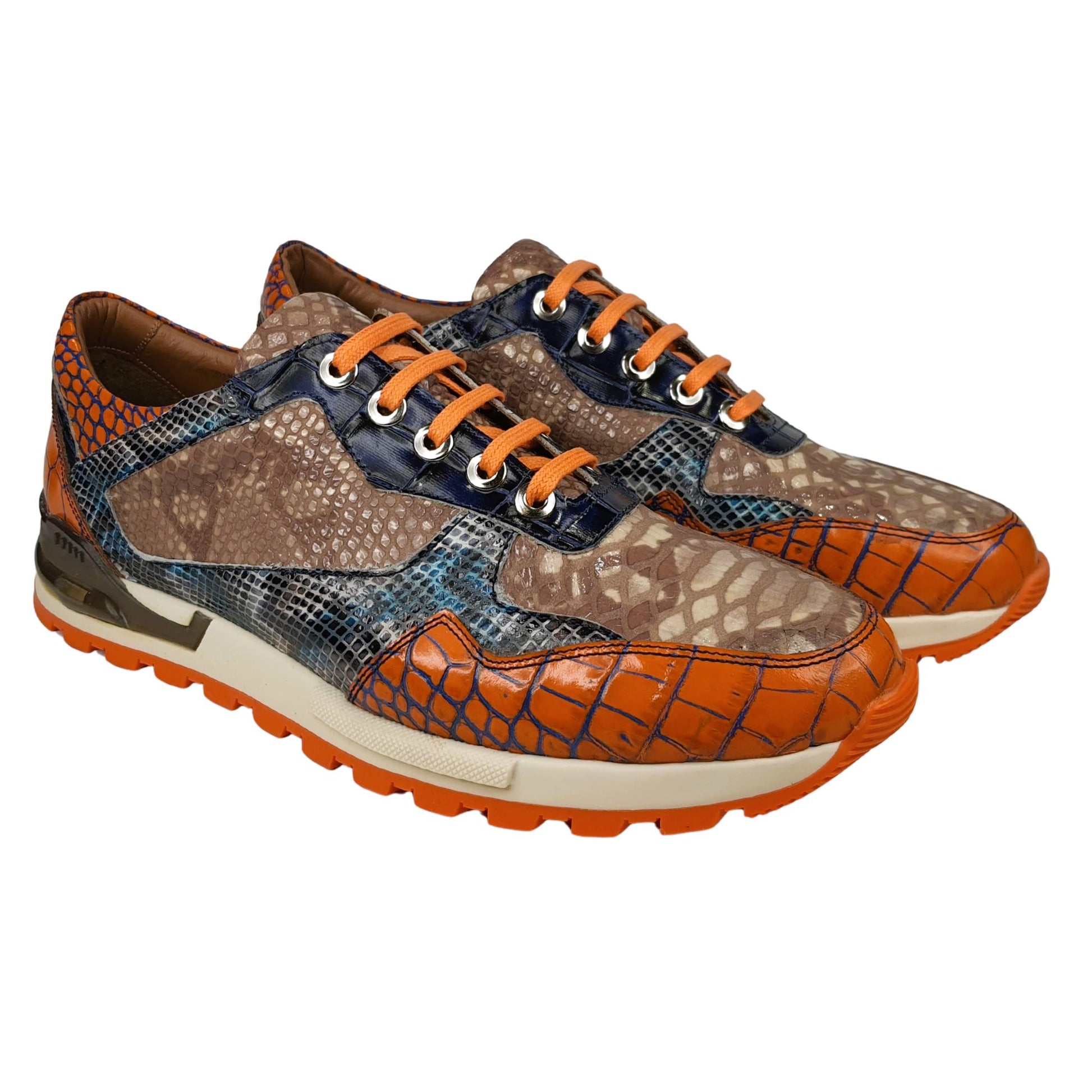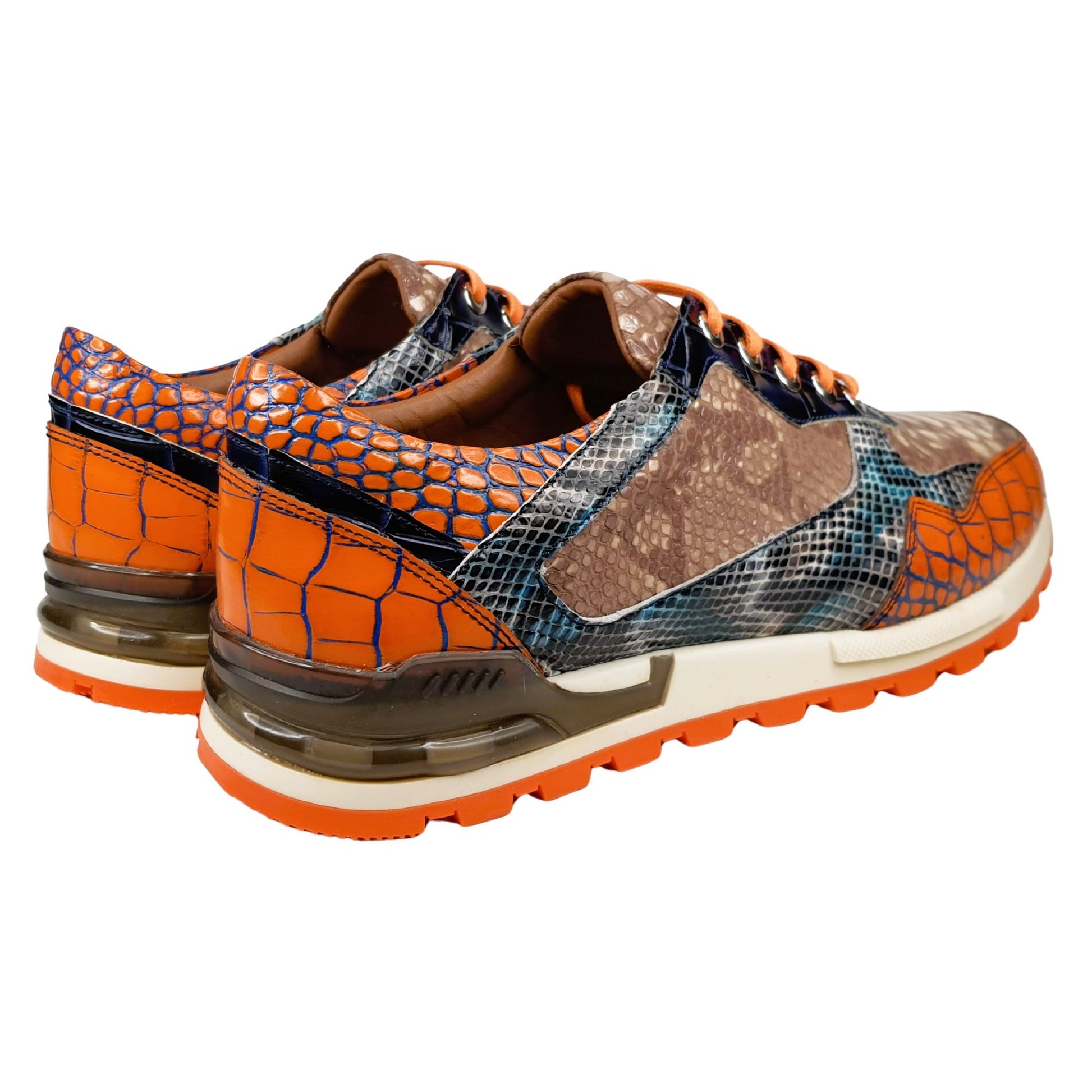 De Bowie is een exclusieve handgemaakte sneaker uitgevoerd in premium leer met unieke reptielpatronen. De combinatie van rijke Oranje, blauw- en beigetinten, hoge glans accenten en een comfortabele, stevige zool maakt dit model een echte statement-sneaker voor de moderne gentleman die durft op te vallen.